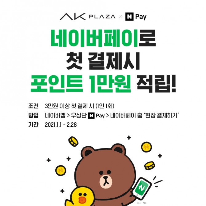 한편 AK플라자는 오는 28일까지 전 점에서 네이버페이 현장결제로 3만 원 이상 처음 결제하는 고객에게 포인트 1만 원을 적립해주는 행사를 연다. AK몰은 오는 13일까지 ‘토스’를 이용해 3만 원 이상 상품을 구매한 고객에게 즉시 10%를 할인해주는 행사를 벌인다.