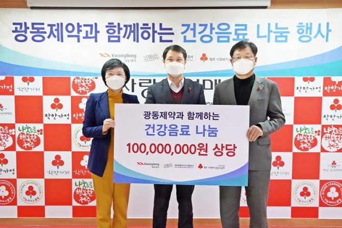이미지 확대보기광동제약(대표이사 최성원)은 제주사회복지공동모금회(회장 김남식)와 함께 ‘광동제약과 함께하는 건강음료 나눔 행사’를 갖고 1억원 상당의 음료를 후원했다고 18일 밝혔다.