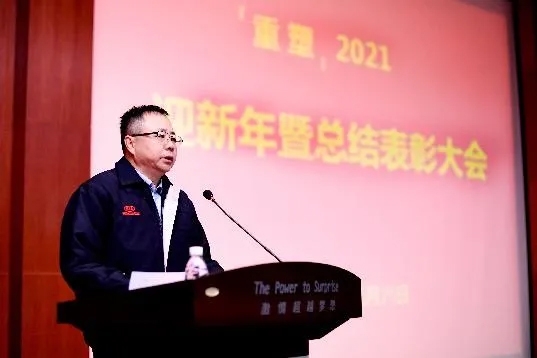 리펑 둥펑위에다기아 총경리가 지난달 7일(현지시간) 신년회에서 올해 경영 전략을 발표하고 있다. 사진=둥펑위에다기아