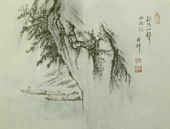 그림 보자. 그림에는 어부들이 등장한다. 관계가 아버지와 아들로 어림잡아 짐작된다. 총 4명의 어부들이 작업하다가 말고 줄행랑, 고깃배를 저어 산을 낀 절벽에 대놓고서 쉬고 있다. 하염없이 산을 보는가 하면 물끄러미 물을 쳐다만 보고 있는 얼굴 표정이 노소를 불문 하고 재미있다. 절벽 바위를 뚫고 나온 꽃나무는 잎이 무성해서 먹빛인데도 푸르게만 느껴진다.