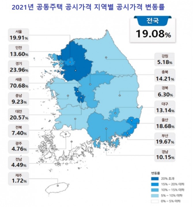 지역별 변동률에서 전국 평균(19.08%)를 초과한 지역은 70.68%의 압도적 상승률을 보인세종시를 포함해 ▲경기(23.96%) ▲대전(20.57%) ▲서울(19.91%) ▲부산(19.67%) 등 5곳이다.