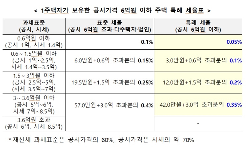 그러나, 공시가격 상승에도 지난해 말 지방세법 개정에 따라 공시가격 6억 원 이하 1주택자는 지난해 재산세보다 줄어들 전망이다. 6억 원 이하 1주택자의 규모는 올해 공시 대상 전체 주택의 92.1%인 1308만 8000가구이며, 서울의 경우 182만 5000가구를 차지한다.