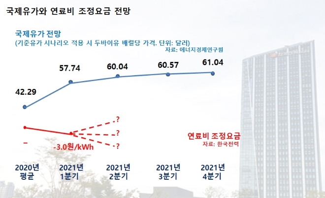 2021년 국제유가 전망과 전기요금 중 연료비 조정요금 추이. 자료=한국전력.에너지경제연구원