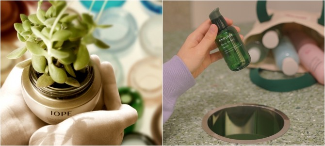 이니스프리도 매장에서 수거한 공병 재활용에 앞장서고 있다. ‘포레스트 포맨 헤어 왁스’는 용기의 30%를 수거한 플라스틱 공병 재활용 원료(PCR PP)로 대체했다. ‘그린티 씨드 세럼 페이퍼보틀’의 캡과 숄더에도 10%를 적용했다. 플라스틱 화장품 공병은 매장용 바닥재와 집기로도 탈바꿈했다. 롯데면세점 코엑스점, 현대면세점 무역센터점의 아모레퍼시픽매장 바닥재와 집기용 상판에 적용했다.