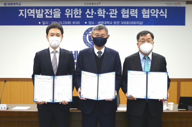 이미지 확대보기코스맥스그룹은 제천시, 세명대학교와 세명대 본관 대회의실에서 지역발전을 위한 산‧학‧관 협력 협약(MOU)을 체결했다고 24일 밝혔다. 이번 협약은 기업-대학-지자체 간 상호 협력을 통해 지역사회와의 상생과 기업 성장, 대학 발전을 추진할 목적으로 마련됐다.