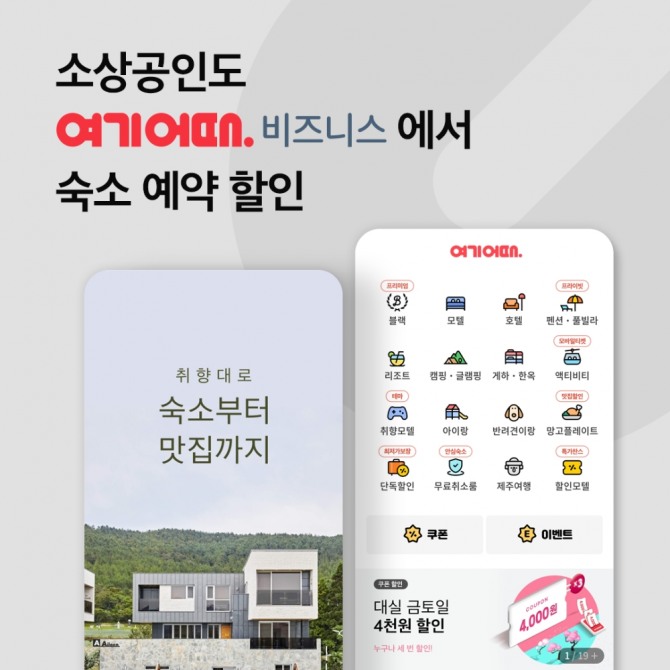 이미지 확대보기여기어때의 기업 전용 숙박 플랫폼 '여기어때 비즈니스'는 중기중앙회와 제휴를 맺고 소속 소상공인과 소기업, 협동조합 임직원을 위한 숙박 예약 혜택을 제공한다고 6일 밝혔다.