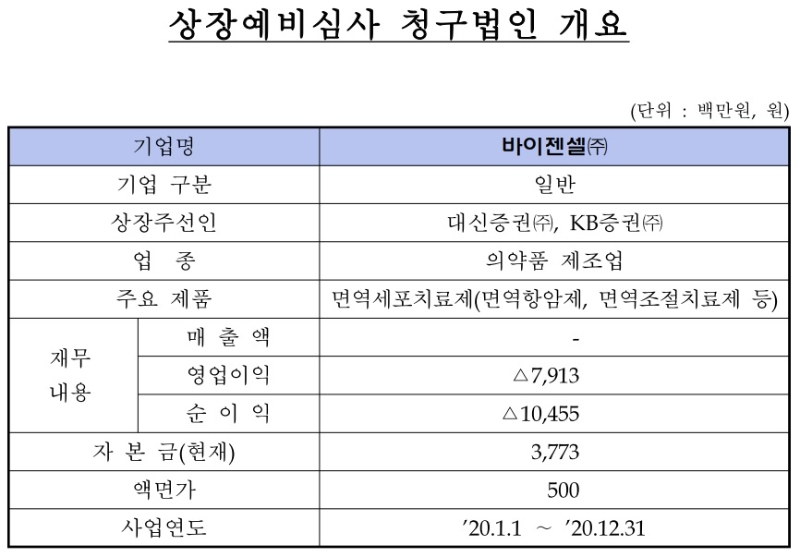거래소에 따르면 바이젠셀은 보령제약 관계사로 면역항암제와 면역조절치료제 등 면역세포치료제를 주요 제품으로 제조하고 있다.