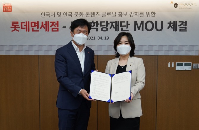 이미지 확대보기롯데면세점은 19일 오후 서울 중구 롯데면세점 본사에서 세종학당재단과 ‘한국어, 한국문화 콘텐츠 글로벌 홍보를 위한 업무협약’ 체결식을 열었다.