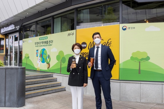 이미지 확대보기앤토니 마티네즈 한국맥도날드 대표와 한정애 환경부 장관은 캠페인의 의미를 더하고 개인컵 사용을 독려하기 위해 맥도날드 코엑스점을 방문했다.
