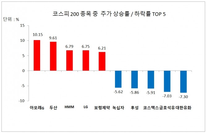 이날 코스피 200 구성종목의 주가상승률 상위 종목과 주가하락률 상위 종목은 다음과 같다.