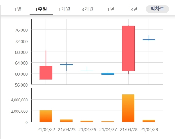 종근당바이오 주가는 종가 기준으로 21일 5만7800원에서 7만7400원으로 약 34% 뛰었다.