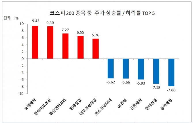 코스피 200 종목 주가 상승률 2위는 현대미포조선으로 9.3% 상승 마감해 조선주 강세를 이어갔다.