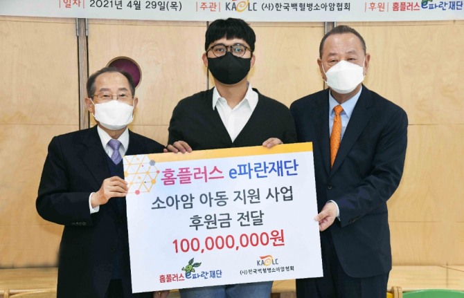 이미지 확대보기지난 29일 오후 마포구 한국백혈병소아암협회에서 이뤄진 전달식에는 박인주 홈플러스 e파란재단 이사장, 이중명 한국백혈병소아암협회장을 비롯해 김동준 비카인드(슛포러브) 대표, 연태준 홈플러스 대외협력 준법경영부문장(부사장)이 참석했다.