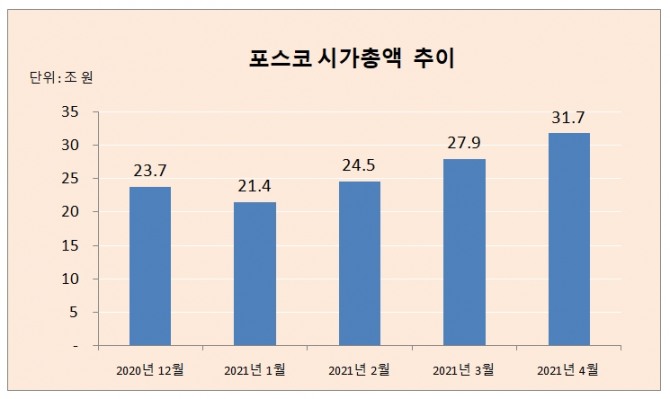 포스코 주가는 지난달 30일 36만4000원으로 마감했다. 4월 한 달간 13.75% 상승하면서 시가총액은 31조7360억 원을 기록했다. 지난해 말 주가 27만 원과 비교하면 주가는 33.82%나 껑충 뛰었다.