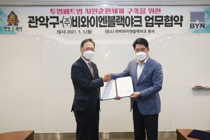 비와이엔블랙야크(이하 블랙야크) 강태선 회장이 지난 3일 블랙야크 양재사옥에서 박준희 관악구청장과 투명 페트병 재활용 활성화 사업 확대를 위해 업무 협약을 체결했다고 4일 밝혔다.