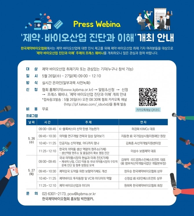 한국제약바이오협회는 오는 26~27일 제약·바이오산업계 취재기자 등을 대상으로 '프레스 웨비나'를 개최한다고 16일 밝혔다. 협회가 제약·바이오산업 기자를 대상으로 세미나를 갖는 것은 이번이 처음이다.