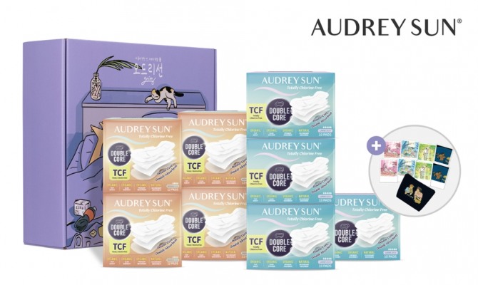 ‘감사의 달 기프트 박스’는 오드리선의 대표 제품인 TCF 더블코어 생리대 중형 4팩과 대형 4팩으로 구성돼 있다. 해당 제품을 사면 그림비 배성태 작가의 삽화가 그려진 파우치와 엽서 세트도 받아볼 수 있다.