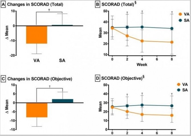 관찰 결과 침 치료군에서 아토피피부염 중증도지수(SCORAD)가 가짜침 치료군에 비해 통계적으로 유의한 감소 결과(11.83점 감소)를 보였다. 특히 침 치료를 시작한 2주 이후부터 대조군과 차이가 나는 개선 효과를 보였으며, 이러한 치료 효과는 침 치료가 종료된 이후에도 4주 간 지속되는 것으로 나타났다. 한편 침 치료 과정 중 심각한 부작용은 나타나지 않았다.