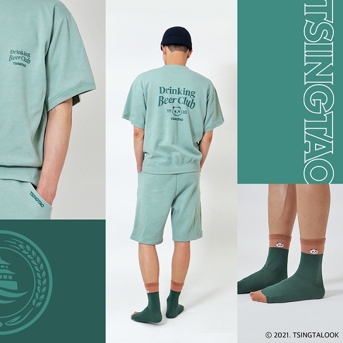 반팔 리버시블 맨투맨 셋업 5종, 양말 5종으로 구성됐고 라거 그린, 위트 크림 등 칭따오의 다섯 가지 제품의 상징 컬러가 반팔 맨투맨 셋업과 양말에 적용됐다.