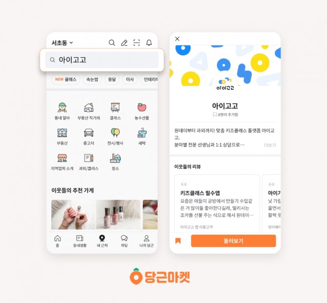 아이고고 클래스는 당근마켓 내 근처 탭 상단 검색을 통해 이용할 수 있다. 검색창에 ‘아이고고'를 입력하면 서비스 소개부터 실제 이웃들의 진솔한 후기까지 자세한 정보를 확인할 수 있다. 아이고고 앱을 따로 설치하지 않아도 클래스 선정, 튜터 선정, 수업 스케줄 관리까지 당근마켓에서 모두 이용할 수 있다.