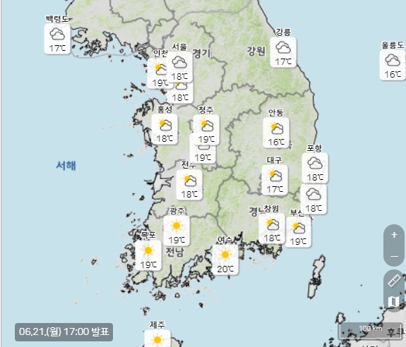 주요 지역별 최저기온은 서울 18도, 인천 19도, 수원 18도, 춘천 17도, 강릉 17도, 청주 19도, 대전 19도, 세종 18도, 전주 18도, 광주 19도, 대구 17도, 부산 19도, 울산 18도, 창원 18도, 제주 21도가 예상된다.