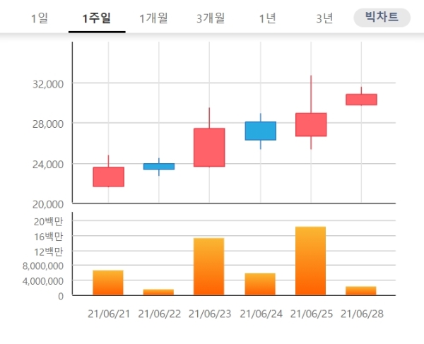 엑세스바이오 주가는 종가기준으로 18일 2만1400원에서 25일 2만8950원으로 35% 뛰었다.