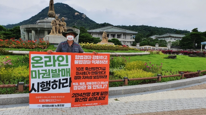 이미지 확대보기관리직·기술직 등 마사회 정규직 직원으로 구성된 한국마사회노조는 '경마 온라인 마권발매 재개를 위한 입법 건의서'를 공개하고, 지난 7일부터 청와대 앞에서 '온라인 발매 입법 촉구를 위한 1인 시위'를 시작했다.