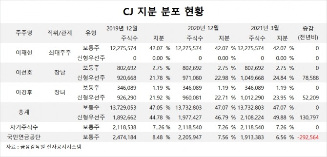이경후 부사장대우는 2019년 말 CJ 신형우선주 지분 21.92%(92만6290주)에서 올해 3월 말 23.95%(101만2290주)로 높이면서 지분 2.03%(8만6000주)를 매입했습니다.