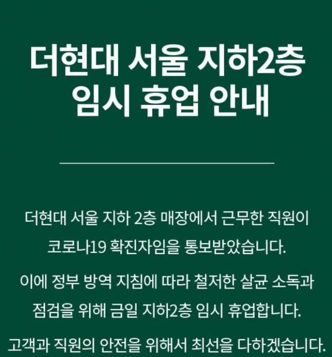 이미지 확대보기이날 현대백화점 측은 더현대서울 공식 홈페이지에 “정부 방역 지침에 따라 철저한 살균 소독과 점검을 위해 금일 지하 2층을 임시 휴업한다”면서 “고객과 직원의 안전을 위해 최선을 다하겠다”고 공지했다.