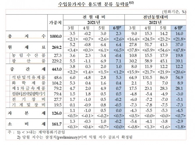 이에 따라 수입물가지수는 지난 3월 9%, 4월 15.3%, 5월 14.2%, 6월 14.0% 등 4개월 연속으로 올랐다. 또 3개월 연속으로 10%대의 상승률을 기록했다.