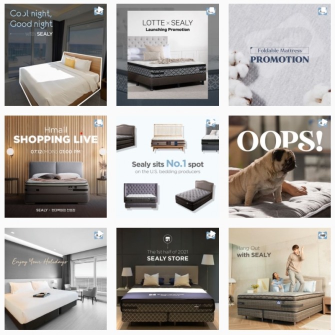 씰리침대 인스타그램은 정보 습득과 상호 소통이 모두 가능한 플랫폼으로 소비자로부터 큰 호응을 받고 있다. 씰리침대는 제품 정보와 프로모션과 같은 브랜드 이슈는 물론 인테리어 요령, 수면 습관별 매트리스 추천 가이드 등 실용적인 정보를 세련되고 감각적인 콘텐츠로 풀어냈다.