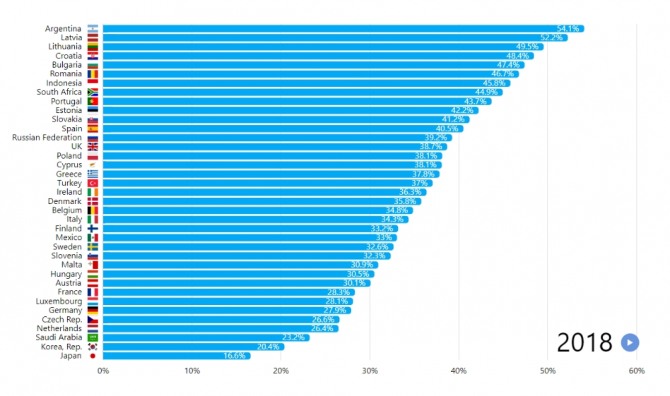 그나마 높은 싱가포르·이탈리아·남아프리카공화국과 미국의 경우가 각각 28%, 23%였고 독일과 폴란드는 공히 16%, 브라질의 경우는 14%였다.