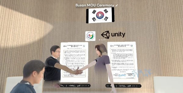 업무 협약식은 코로나19로 인한 사회적 거리두기 단계 격상으로 인해 '메타버스' 속에서 진행됐다. 유니티 측은 서울, 부산광역시교육청 측은 부산에서 유니티 엔진 기반 증강현실(AR) 협업 플랫폼 '스페이셜(Spatial)에 접속해 이번 협약을 체결했다.
