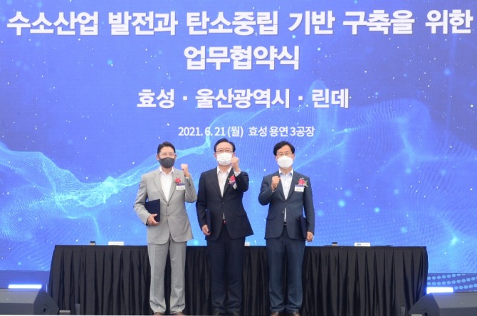 (왼쪽부터)조현준 효성그룹 회장, 송철호 울산 시장, 성백석 린데 한국 지사 회장이 지난 6월 울산 용연3공장 액화플랜트 예정부지에서 수소산업 발전과 탄소중립 기반 구축을 위한 업무협약(MOU)을 체결한 후 사진 촬영을 하고 있다. 사진=효성그룹