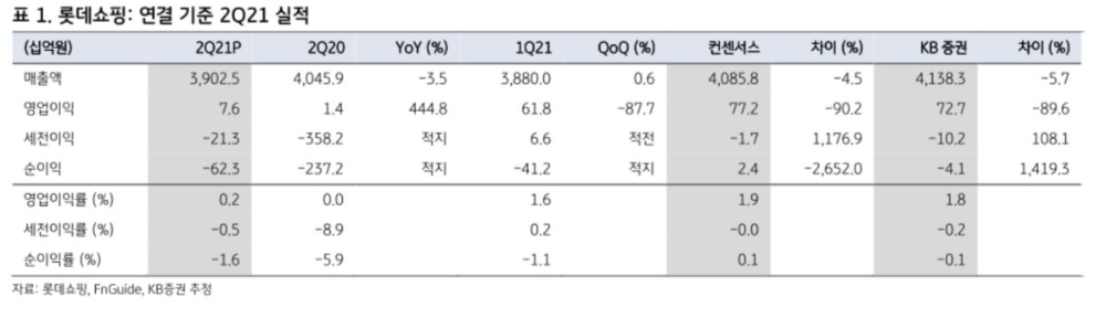 기록적인 신장 폭이지만, 2분기 실적은 당초 증권사들의 예상치에는 한참 밑도는 '어닝쇼크' 수준이다. 에프엔가이드가 지난 5일 내놓은 롯데쇼핑 2분기 실적 증권사 전망치 평균을 보면 영업이익은 772억 원, 매출액은 4조 858억 원 수준이었다. 그러나 롯데쇼핑의 실제 영업이익은 전망치의 9.9% 수준에 그쳤다.