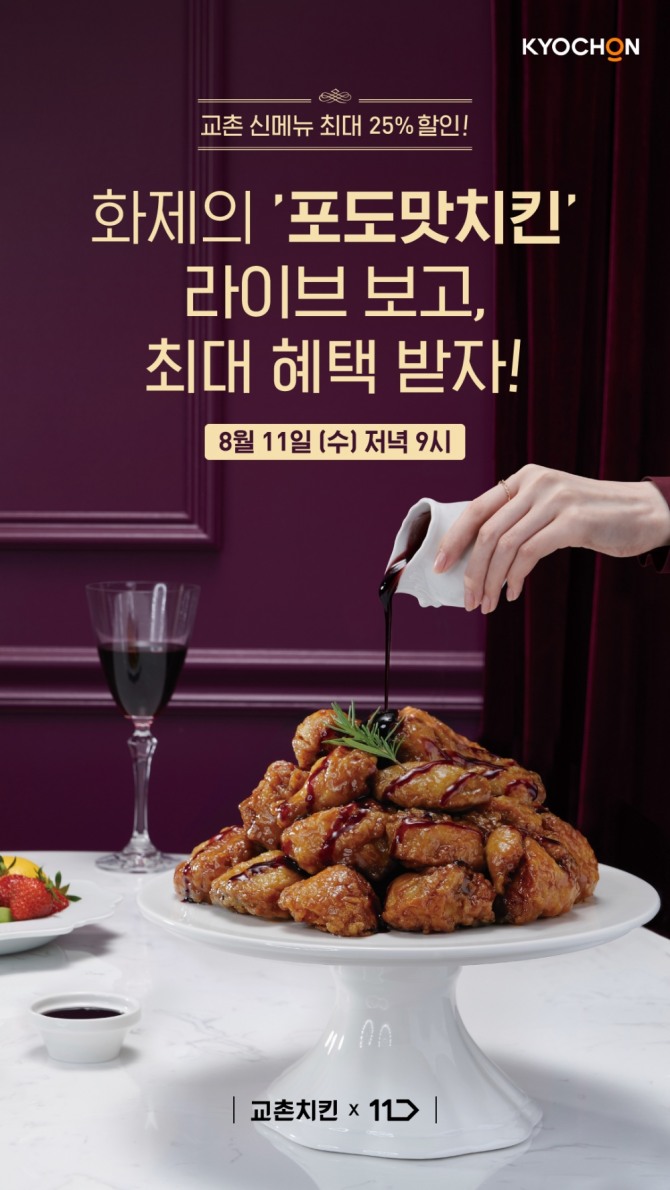 국내 대표 치킨 프랜차이즈 교촌치킨은 11번가 라이브 방송을 통해 신제품 발사믹치킨 및 교촌 메뉴 할인 혜택을 제공한다.