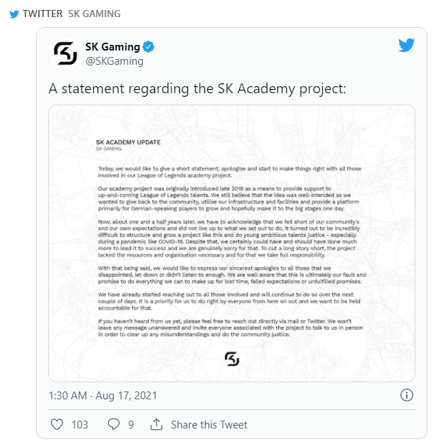 SK게이밍아카데미 비비이(Viviii) 팀장은 최근 자신의 트위터에 'SK아카데미-여러분이 기다려온 드라마'라는 제목으로 성추행 의혹을 제기했다. 아카데미 선수들이 경영진과 연락할 수도 없었고 계약서를 작성하지도 않았고 심지어는 급여를 받지 못했다는 주장이다.