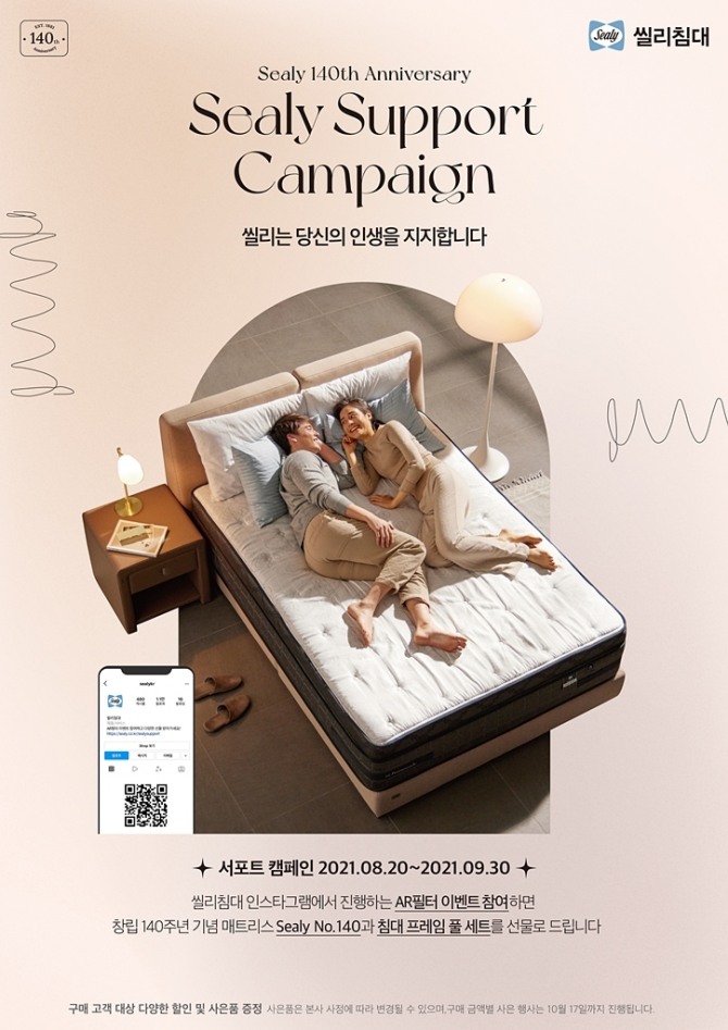 광고 영상 공유 이벤트는 씰리침대 홈페이지에서 광고 영상을 시청하고 개인 SNS에 필수 해시태그와 함께 공유하면 된다. 씰리침대는 두 이벤트 참여자 중 140명을 뽑아 ‘씰리 No.140(Sealy No.140)’ 매트리스와 프레임으로 이뤄진 침대 세트 등 경품을 제공한다.
