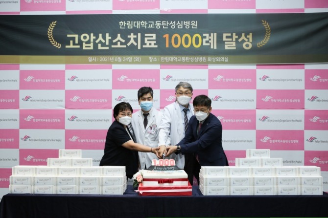 이미지 확대보기한림대학교동탄성심병원(병원장 이성호)은 고압산소치료 1000례 돌파를 기념해 지난 24일 본관 화상회의실에서 온라인과 오프라인으로 기념행사를 개최했다고 25일 밝혔다.