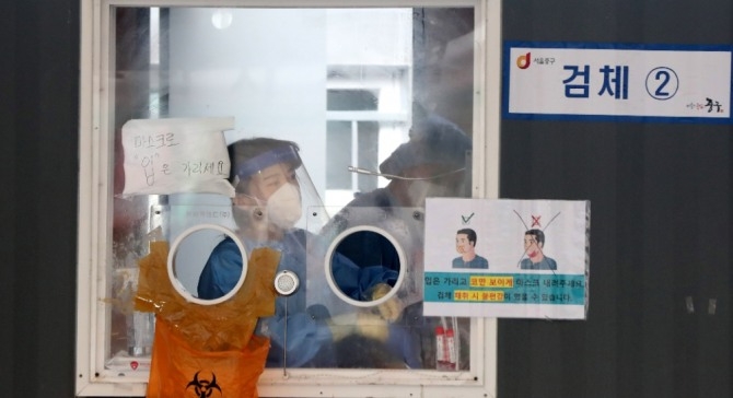 서울 중구 서울역광장에 설치된 임시선별검사소에서 의료진이 교대를 하고 있다. 사진=뉴시스