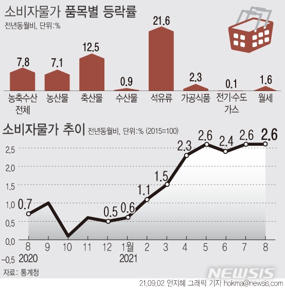 통계청 관계자는 "경기가 회복하면서 수요 측면 상승 압력이 확대된 가운데 농축수산물과 국제유가 등 공급 측면 상승 요인이 예상보다 컸다"고 설명했다.