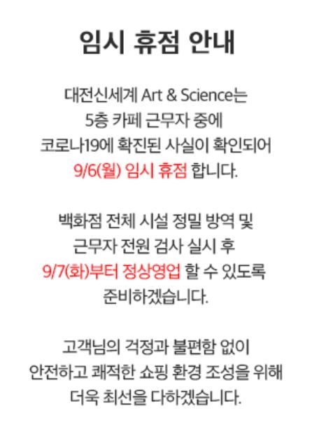 이미지 확대보기6일 관련 업계에 따르면 지난 8월 27일 문을 연 대전신세계 아트앤사이언스 백화점(이하 대전신세계)에서 신종 코로나바이러스 감염증(코로나19) 확진자가 발생했다.