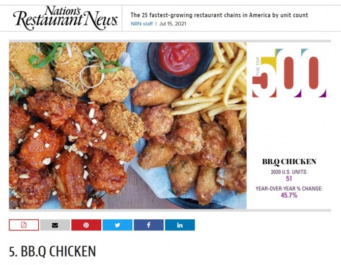 글로벌 외식업 전문지 ‘네이션스 레스토랑 뉴스’는 미국 내 가장 빠르게 성장한 외식 브랜드 25위에 BBQ가 포함됐으며 5위를 차지했다고 8일 발표했다. 1956년 발간한 네이션스 레스토랑 뉴스는 외식업계 소식지로 많은 구독자와 공신력을 지닌 매체다.