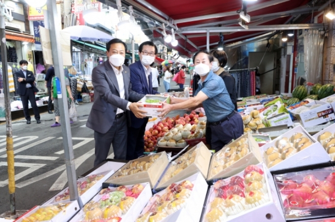 이어 북수원 시장으로 발길을 옮긴 장현국 의장은 떡, 사과, 건어물 등 제수용품과 간식거리를 온누리 상품권으로 구매하며 지역 상인들과 명절 인사를 주고 받았다.