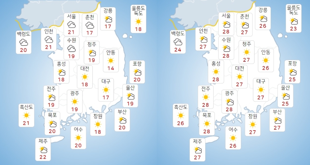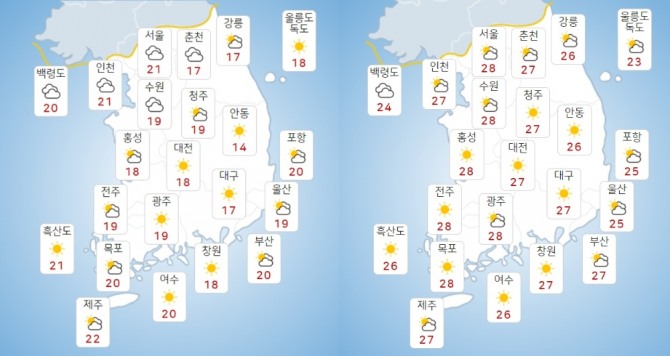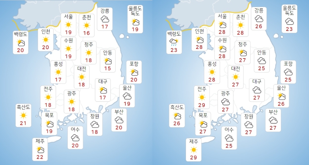 기상청에 따르면 19일 아침 최저기온은 14∼21도, 낮 최고기온은 24∼29도라고 예보했다. 내륙을 중심으로 낮·밤의 기온 차가 10도 이상으로 크겠다. 미세먼지 농도는 전 권역에서 '좋음' 수준을 보이겠다.