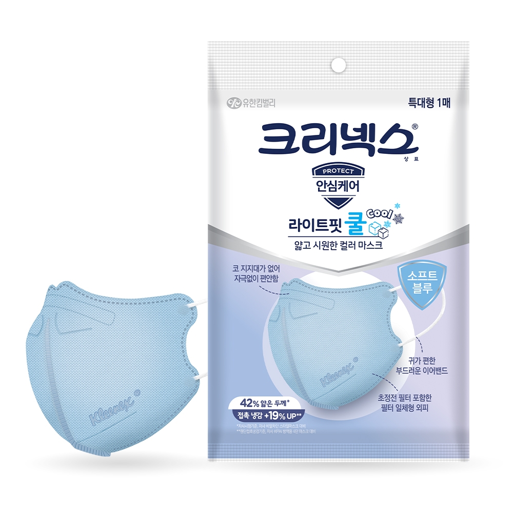 다채로운 사이즈와 함께, 크리넥스 라이트핏 쿨 마스크는 초정전 필터일체형 외피원단을 적용했고 필터에서 이어밴드에 이르는 주요자재도 모두 국산이어서 높은 안심감을 제공한다. 이외에도 더욱 가벼운 착용감을 위한 혁신 기술과 디자인도 반영됐다. 기존 자사 제품 대비 두께가 42%나 얇아졌고, 탄력성 있는 소프트 이어밴드를 적용했으며, 코 지지대 없는 디자인을 채용했다. 트렌디한 컬러로 소비자의 개성도 살릴 수 있는 장점 또한 있다.