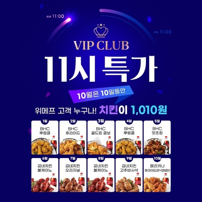 위메프는 10월 1일부터 10일까지 ‘11시특가’ 행사에서 인기 있는 치킨 브랜드 메뉴를 1010원에 한정 수량 판매한다고 29일 밝혔다. 11시특가는 행사 기간 동안 매일 오전, 오후 11시에 연다.