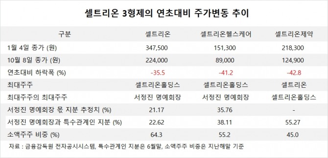 셀트리온제약은 최대주주가 셀트리온으로 되어 있어 셀트리온 3형제 합병시 비교적 논란이 덜할 수 있지만 셀트리온제약의 주가가 지나치게 낮게 형성될 경우 소액주주들의 반발이 커질 것으로 예상됩니다.