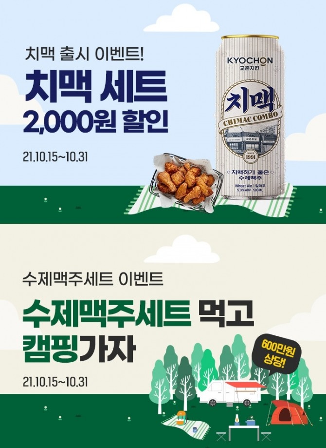 교촌치킨은 교촌 주문 앱에서 치맥세트와 혼맥세트를 주문한 고객 중 일부를 추첨해 100만 원 상당의 글램핑 패키지(2명), 고급 캠핑용 텐트(2명), 캠핑용품(2명), 교촌 모바일 상품권(20명)을 증정한다.