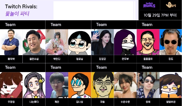 이미지 확대보기이번 대회에 참여하는 스트리머 16명은 2명씩 총 8개 팀을 구성해 순위를 겨룬다. 총 상금 규모는 1만 5000달러(1754만 원), 우승 상금은 3000달러(351만 원)다.